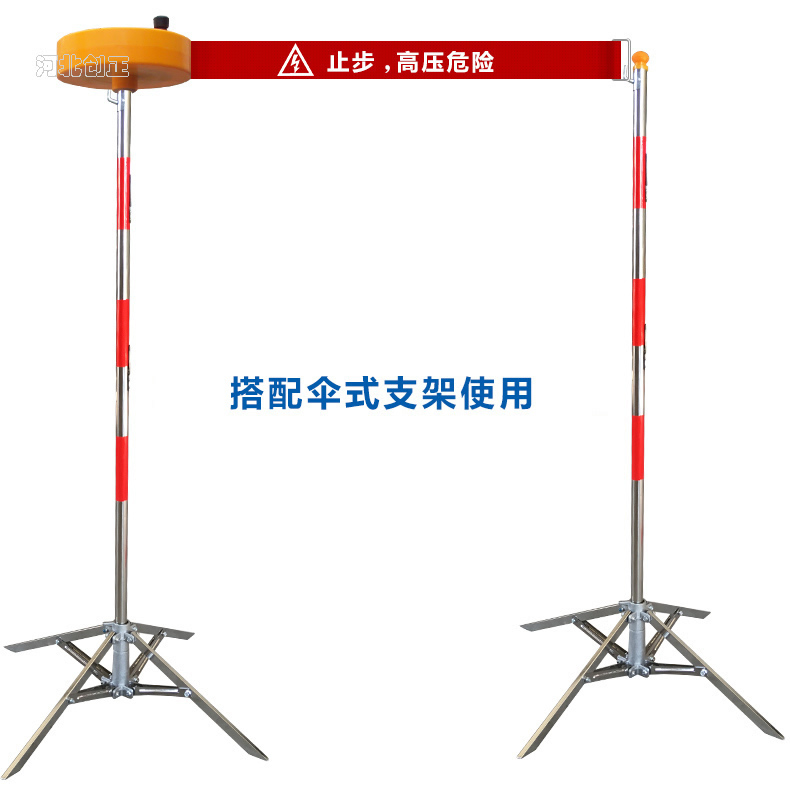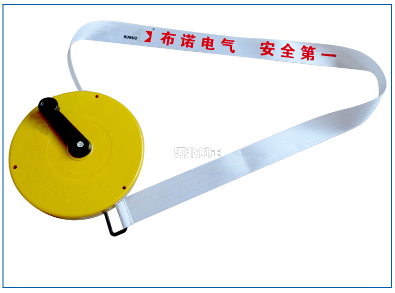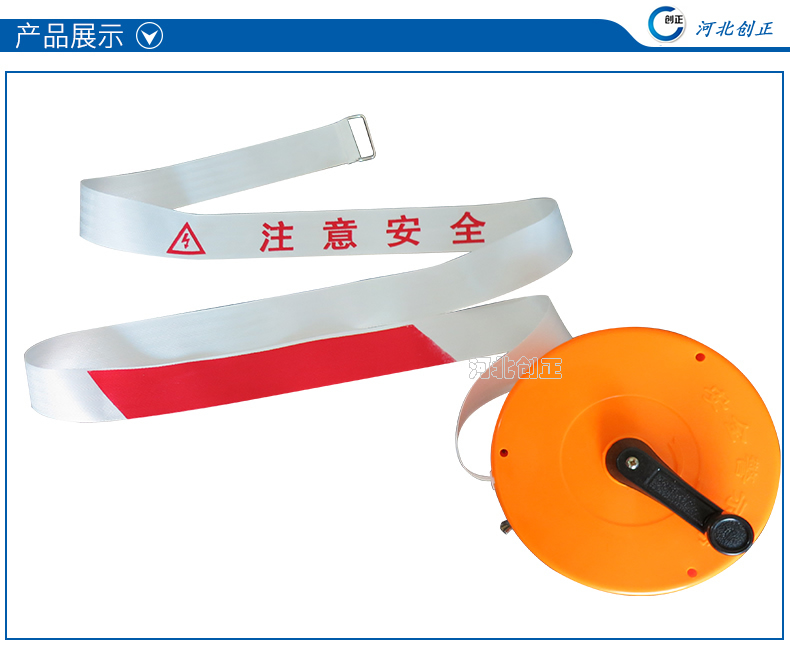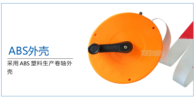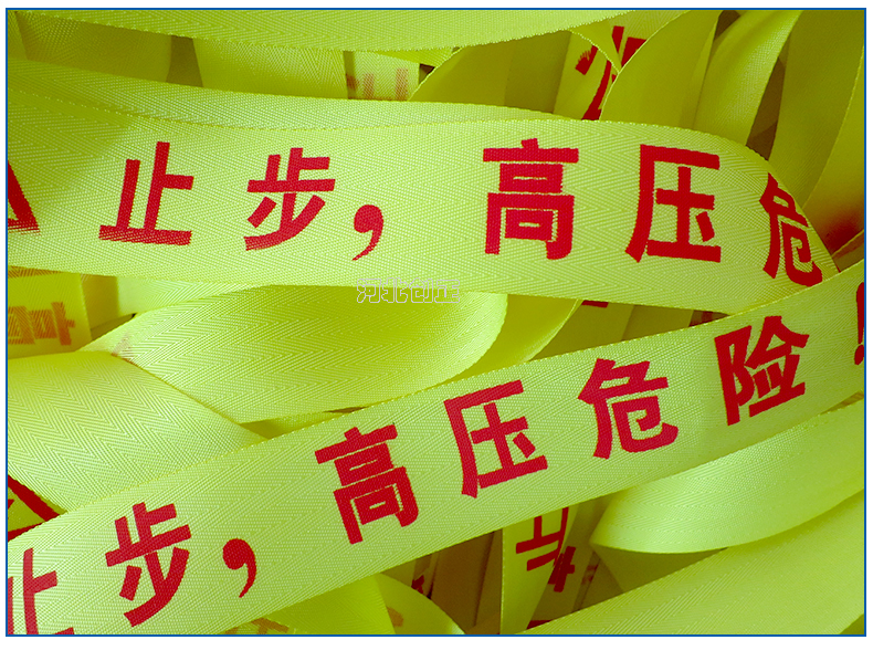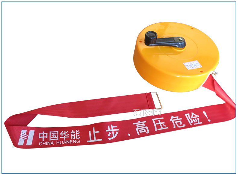 警示帶盒是ABS材料制成;帶是錦綸材質(zhì),上面印有“閃電符號,止步,高壓危險(xiǎn)”等字樣。