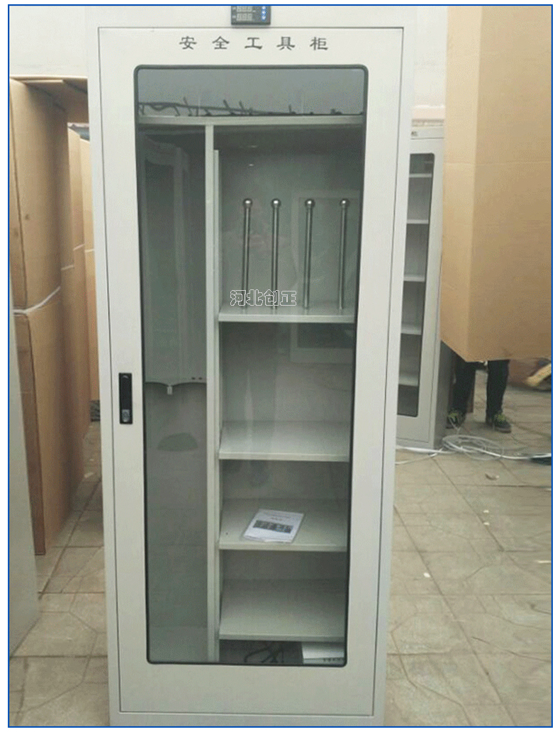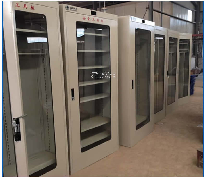 1、柜體是冷軋鋼板卷壓成型,厚度有1.0mm,1.2mm,1.5mm供選擇。柜體表面采用靜電防腐噴塑工藝,顏色為駝灰色,柜門裝有通體透明鋼化玻璃,透過玻璃可以看到分類有序的工器具。