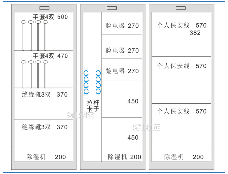 2、智能型安全工具柜裝有溫濕度顯示表和控制操作面板,顯示溫濕度和設(shè)備運(yùn)行狀態(tài)。柜底可選擇安裝萬向輪和定位螺桿;柜頂可選擇安裝吊杯,方便運(yùn)輸。應(yīng)用于不同溫濕度地區(qū)的不同電壓等級的變電站、集控站、線路工區(qū)以及電力公司等單位。
