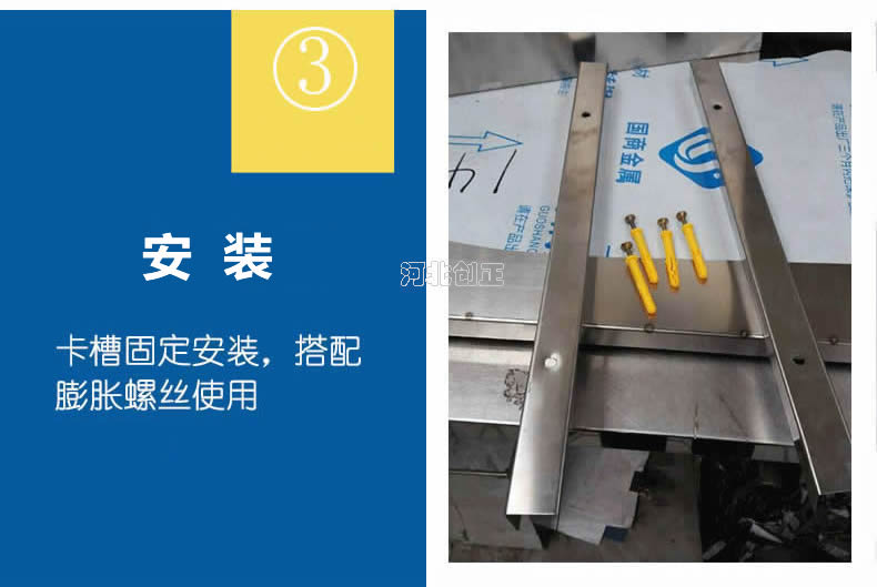 不銹鋼擋鼠板安裝簡單,先將膨脹螺釘(內(nèi)膨脹也叫漲塞)穿入卡槽上的安裝孔,再將兩側(cè)的卡槽沿門框?qū)⑴蛎浡葆斊叫泄潭ǖ介T框兩邊墻體上,卡槽安裝成功。使用時(shí)把擋鼠板順卡槽的內(nèi)徑滑入卡槽之中。不用時(shí)將擋鼠板取出,固定在墻體上的卡槽不影響門的正常開關(guān),不用取下。