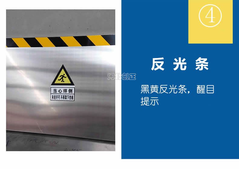不銹鋼擋鼠板表面經(jīng)防腐處理。擋板上部貼有黃黑相間的反光條,起到警示作用。